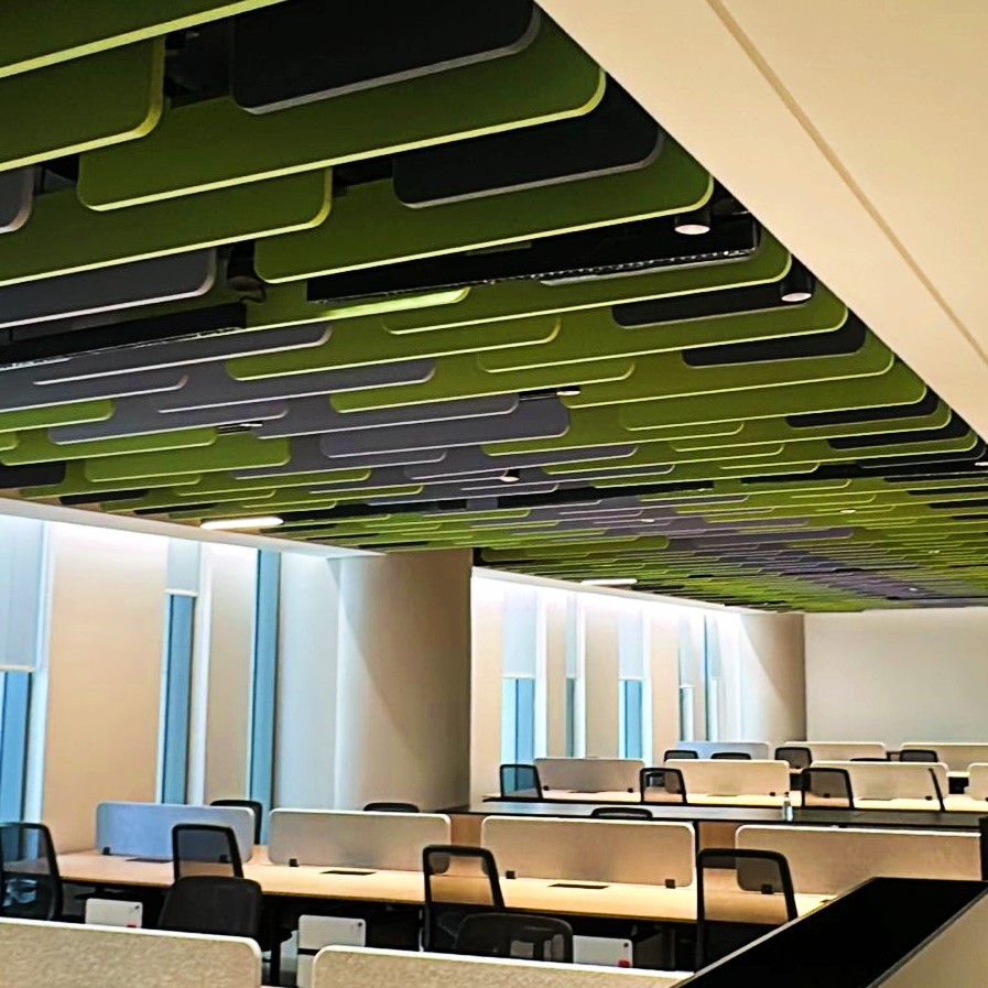 Manufactured from high-performance polyester fibre (PET), these panels contribute to improved indoor air quality and are certified for low VOC emissions. The ceiling range includes baffles, rafts, and tile systems that blend well with most ceiling grids or suspension designs. With a choice of colours, sizes, and NRC values, you can tailor the acoustic performance to meet your specific project goals.